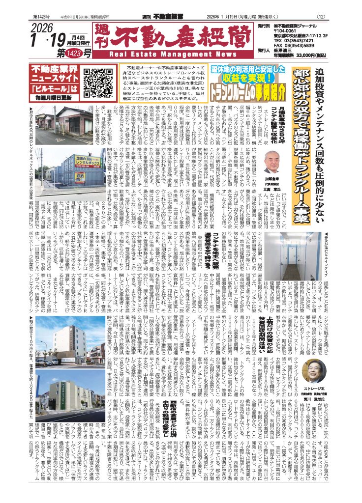 本日(1/19)発行「週刊不動産経営新聞」のトランクルーム事業特集に記事が掲載されました。